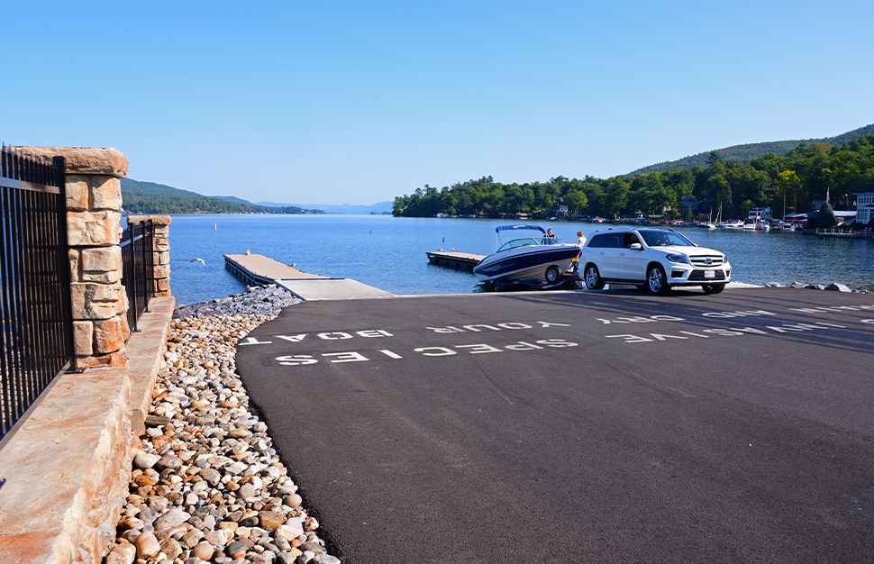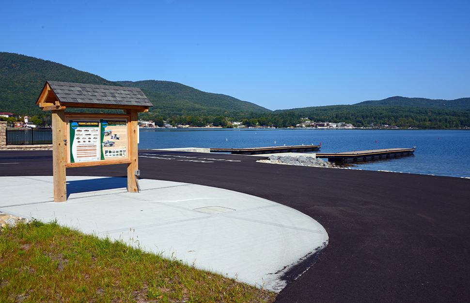 An invasive species boat washing, and inspection station was included, featuring pre-cast porous concrete and a built-in sand filter system, where boats can be screened and washed of invasive species before coming in and leaving Lake George. The new boat launch was relocated and designed based on lake depth to improve user experience and minimize disturbance to the lake bottom during launching and docking procedures. Seven different water treatment processes were integrated into the facility that also improved transportation and mobility functions. The site is a test bed for a new pothole-proof road design, long-term testing of new durable coatings, and the use of porous pavement systems as a lightweight roadway design.
