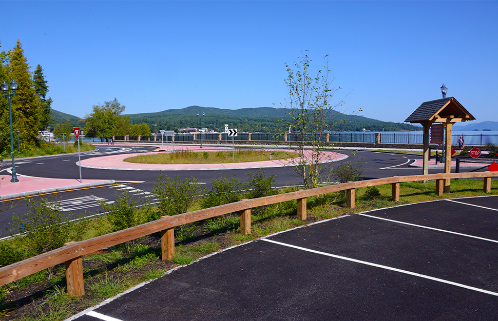 This project held many challenging goals, among them: improving water quality in Lake George; incorporating and promoting green infrastructure practices; increasing pedestrian, bicyclist, and motorist safety; reducing the spread of waterborne invasive species; and improving beachgoer and recreational boater access. The project also sought to improve traffic management and circulation, reduce motorist and pedestrian conflict points, reduce motor vehicle speeds, update for ADA compliance, and promote alternate modes of transportation. Adding to the challenges, the project needed to be designed, permitted, constructed, and open to the public in 14 months with construction in the off-season.